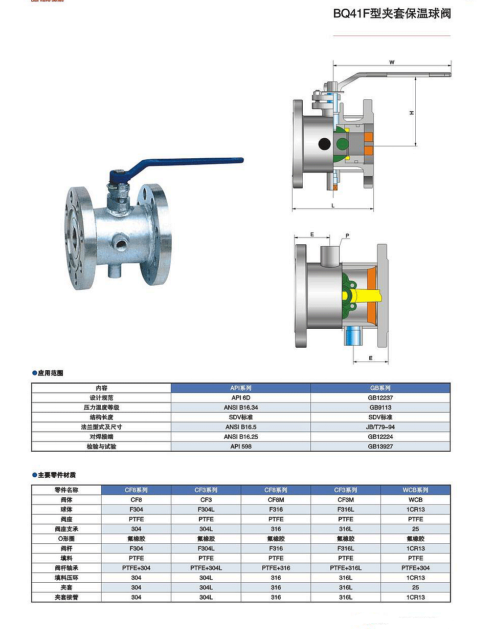 BQ41F型保溫球閥具有良好的保溫保冷特性,且閥門(mén)的通徑與管徑一致,同時(shí)又能有效降低管路中介質(zhì)熱量損失。主要用于石油、化工、冶金、制藥、食品等各類(lèi)系統(tǒng)中,以輸送常溫下會(huì)凝固的高粘度介質(zhì)。由于采用整體式結(jié)構(gòu),因而B(niǎo)Q41F球閥比一般球閥更小,重量更輕,且無(wú)外漏,密封性能良好,夾套采用碳素鋼管焊接比鑄造的更加耐壓牢固。