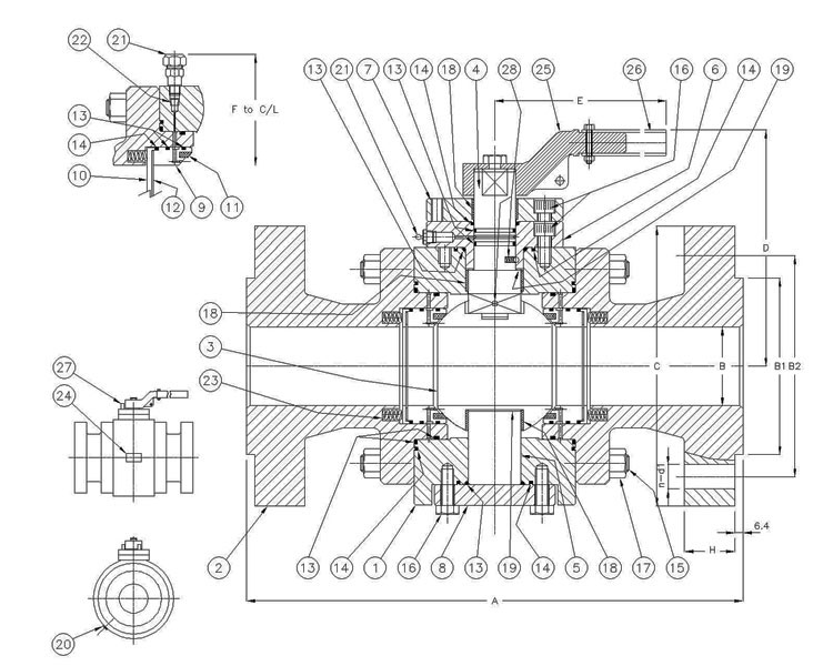 注:其中三段式硬密封法蘭球閥結構尺寸與軟密封三片式球閥相同。