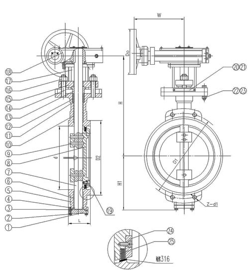 D371X對(duì)夾式蝸輪傳動(dòng)軟密封蝶閥主要零部件材料:
